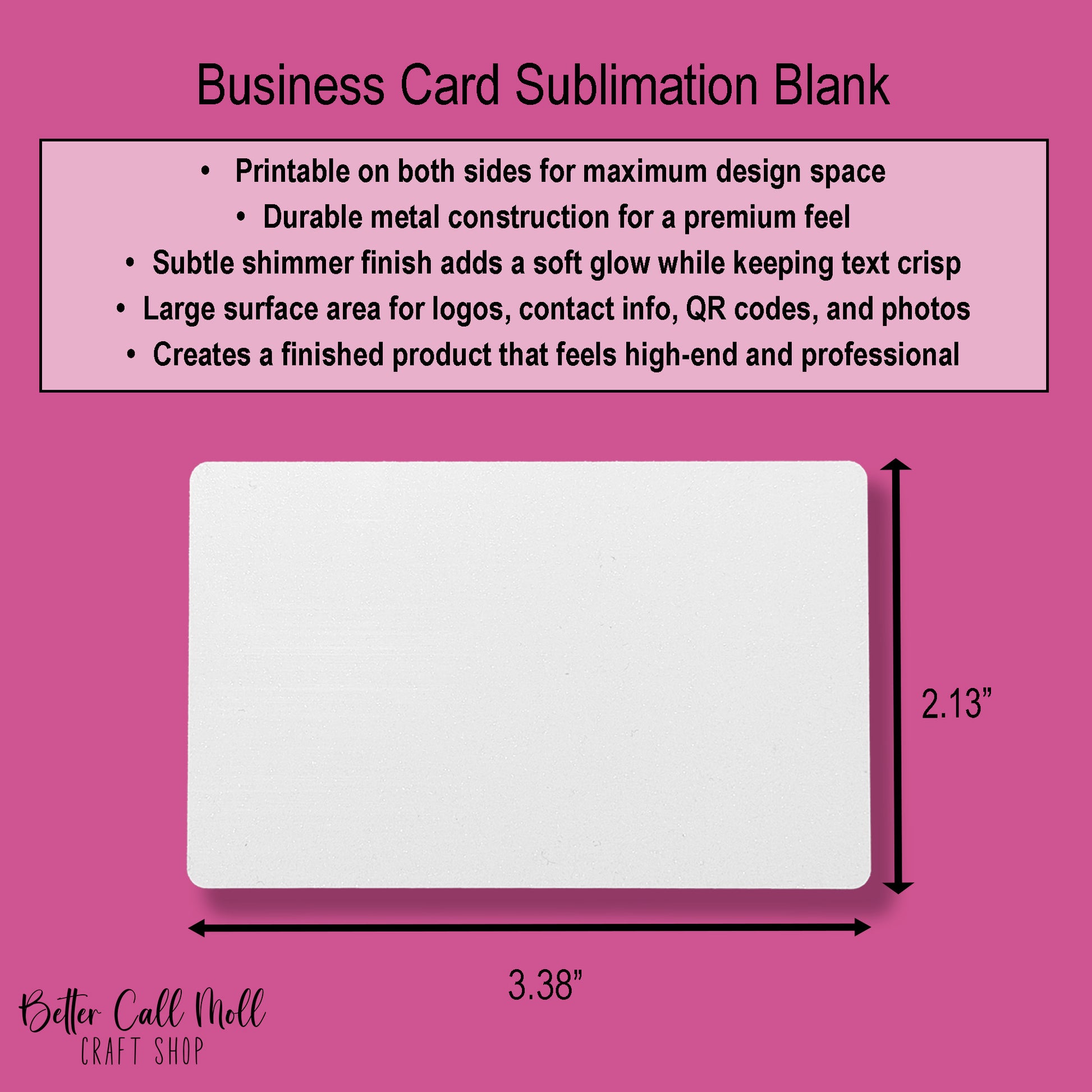 💼 Create premium metal cards that stand out instantly. Our Double-Sided Metal Business Card Sublimation Blanks feature a subtle shimmer finish that adds a soft, professional glow without overpowering your designs. With a generous 3.38" × 2.13" size and full double-sided printing, these cards are perfect for branding, VIP cards, photo keepsakes, and custom promotional pieces.